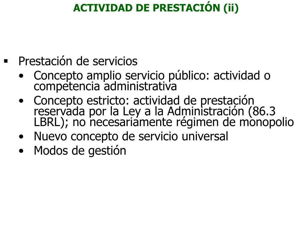 ACTIVIDAD DE PRESTACIÓN (ii) • Prestación de servicios • Concepto amplio servicio público: actividad o competencia administrativa • Concepto estricto: actividad de prestación reservada por la Ley a la Administración (86.3 LBRL); no necesariamente régimen de monopolio • Nuevo concepto de servicio universal • Modos de gestión