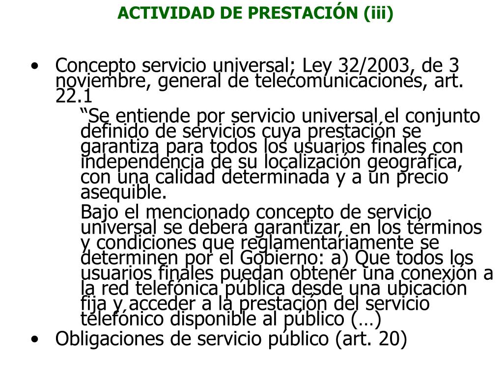 ACTIVIDAD DE PRESTACIÓN (iii) • Concepto servicio universal; Ley 32/2003, de 3 noviembre, general de telecomunicaciones, art. 22.1 • “Se entiende por servicio universal el conjunto definido de servicios cuya prestación se garantiza para todos los usuarios finales con independencia de su localización geográfica, con una calidad determinada y a un precio asequible. • Bajo el mencionado concepto de servicio universal se deberá garantizar, en los términos y condiciones que reglamentariamente se determinen por el Gobierno: a) Que todos los usuarios finales puedan obtener una conexión a la red telefónica pública desde una ubicación fija y acceder a la prestación del servicio telefónico disponible al público (…) • Obligaciones de servicio público (art. 20)