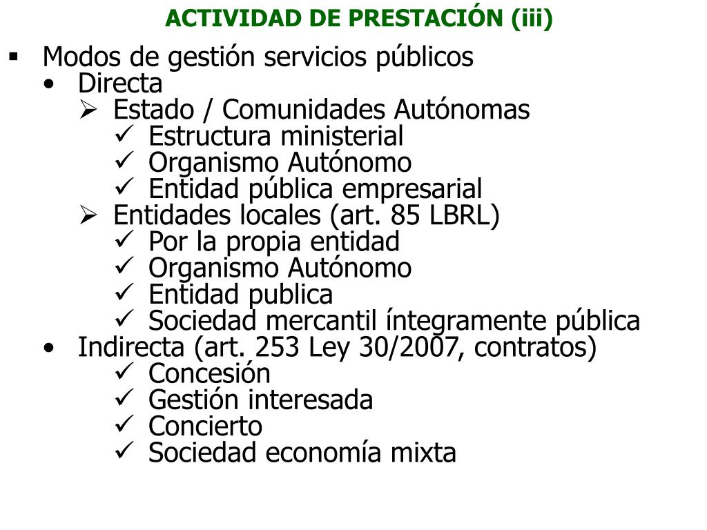 ACTIVIDAD DE PRESTACIÓN (iii) • Modos de gestión servicios públicos • Directa • Estado / Comunidades Autónomas • Estructura ministerial • Organismo Autónomo • Entidad pública empresarial • Entidades locales (art. 85 LBRL) • Por la propia entidad • Organismo Autónomo • Entidad publica • Sociedad mercantil íntegramente pública • Indirecta (art. 253 Ley 30/2007, contratos) • Concesión • Gestión interesada • Concierto • Sociedad economía mixta
