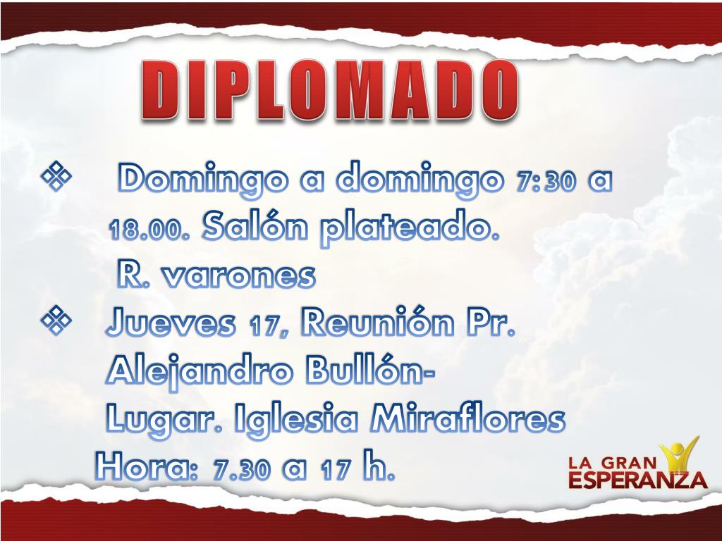 DIPLOMADO • Domingo a domingo 7:30 a 18.00. Salón plateado. • R. varones • Jueves 17, Reunión Pr. Alejandro Bullón- • Lugar. Iglesia Miraflores • Hora: 7.30 a 17 h.