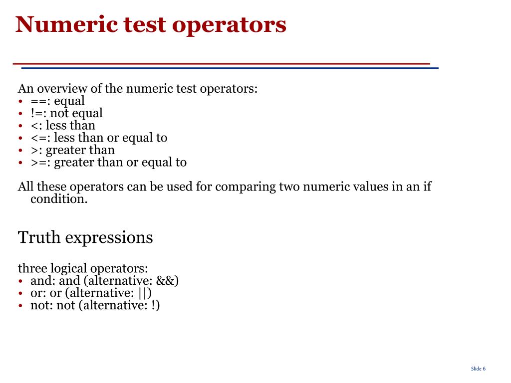 Numeric test operators • An overview of the numeric test operators: • ==: equal • !=: not equal • <: less than • <=: less than or equal to • >: greater than • >=: greater than or equal to • All these operators can be used for comparing two numeric values in an if condition. • Truth expressions • three logical operators: • and: and (alternative: &&) • or: or (alternative: ||) • not: not (alternative: !)