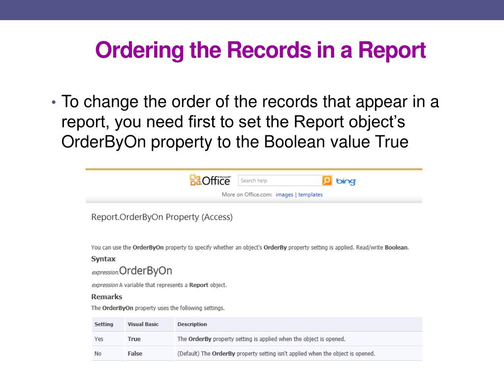 Ordering the Records in a Report • To change the order of the records that appear in a report, you need first to set the Report object’s OrderByOn property to the Boolean value True