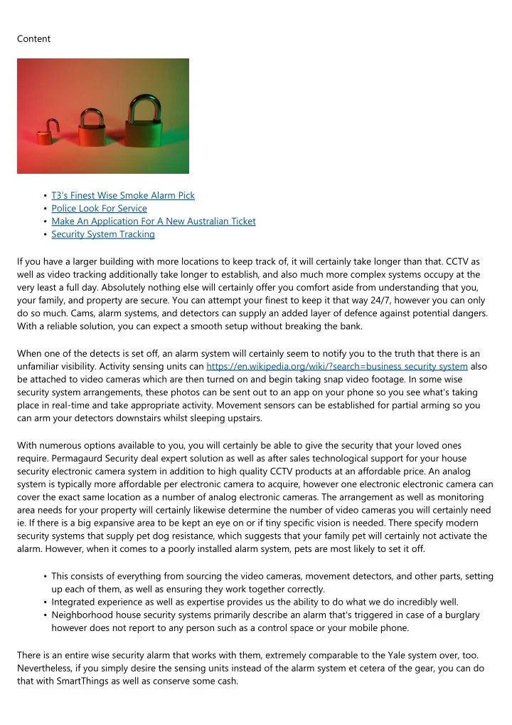 Content • • • • T3's Finest Wise Smoke Alarm Pick Police Look For Service Make An Application For A New Australian Ticket Security System Tracking If you have a larger building with more locations to keep track of, it will certainly take longer than that. CCTV as well as video tracking additionally take longer to establish, and also much more complex systems occupy at the very least a full day. Absolutely nothing else will certainly offer you comfort aside from understanding that you, your family, and property are secure. You can attempt your finest to keep it that way 24/7, however you can only do so much. Cams, alarm systems, and detectors can supply an added layer of defence against potential dangers. With a reliable solution, you can expect a smooth setup without breaking the bank. When one of the detects is set off, an alarm system will certainly seem to notify you to the truth that there is an unfamiliar visibility. Activity sensing units can https://en.wikipedia.org/wiki/?search=business security system also be attached to video cameras which are then turned on and begin taking snap video footage. In some wise security system arrangements, these photos can be sent out to an app on your phone so you see what's taking place in real-time and take appropriate activity. Movement sensors can be established for partial arming so you can arm your detectors downstairs whilst sleeping upstairs. With numerous options available to you, you will certainly be able to give the security that your loved ones require. Permagaurd Security deal expert solution as well as after sales technological support for your house security electronic camera system in addition to high quality CCTV products at an affordable price. An analog system is typically more affordable per electronic camera to acquire, however one electronic electronic camera can cover the exact same location as a number of analog electronic cameras. The arrangement as well as monitoring area needs for your property will certainly likewise determine the number of video cameras you will certainly need ie. If there is a big expansive area to be kept an eye on or if tiny specific vision is needed. There specify modern security systems that supply pet dog resistance, which suggests that your family pet will certainly not activate the alarm. However, when it comes to a poorly installed alarm system, pets are most likely to set it off. • This consists of everything from sourcing the video cameras, movement detectors, and other parts, setting up each of them, as well as ensuring they work together correctly. Integrated experience as well as expertise provides us the ability to do what we do incredibly well. Neighborhood house security systems primarily describe an alarm that's triggered in case of a burglary however does not report to any person such as a control space or your mobile phone. • • There is an entire wise security alarm that works with them, extremely comparable to the Yale system over, too. Nevertheless, if you simply desire the sensing units instead of the alarm system et cetera of the gear, you can do that with SmartThings as well as conserve some cash.