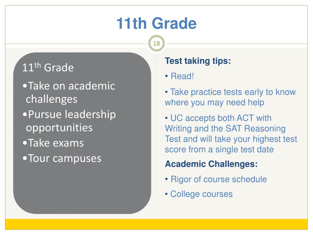 11th Grade • 11th Grade • Take on academic challenges • Pursue leadership opportunities • Take exams • Tour campuses • Test taking tips: • Read! • Take practice tests early to know where you may need help • UC accepts both ACT with Writing and the SAT Reasoning Test and will take your highest test score from a single test date • Academic Challenges: • Rigor of course schedule • College courses