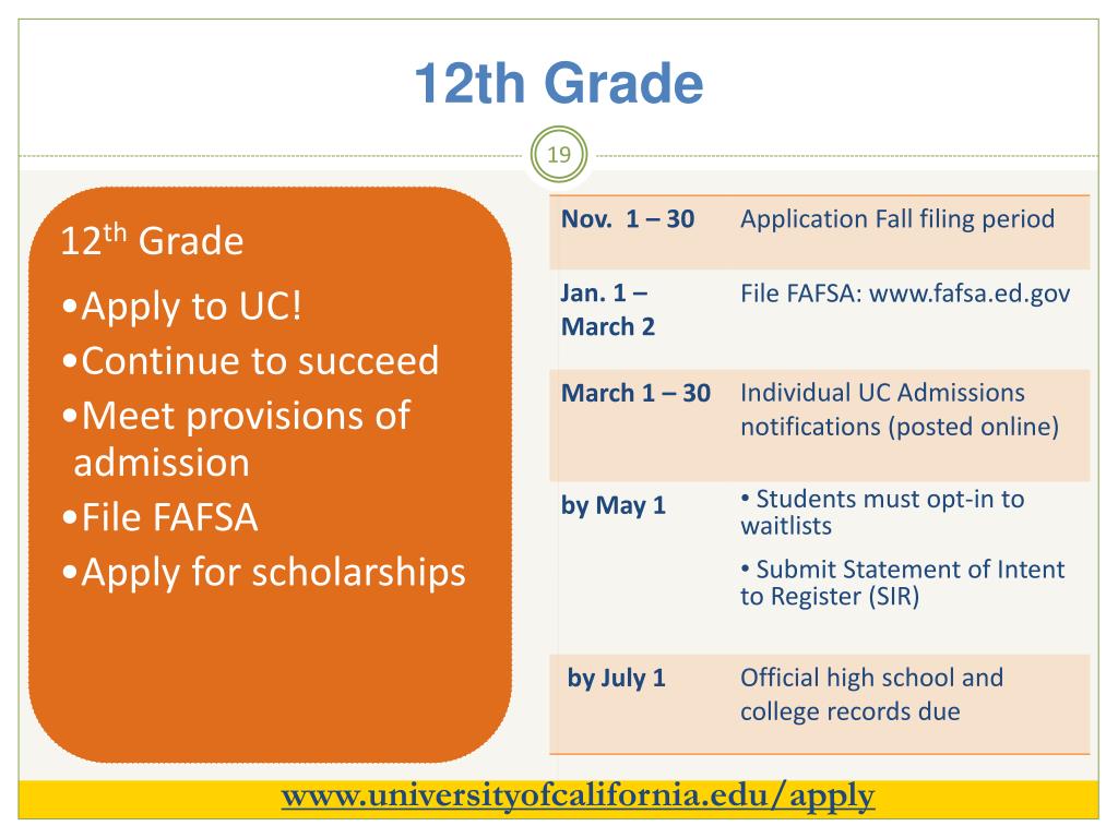 12th Grade • 12th Grade • Apply to UC! • Continue to succeed • Meet provisions of admission • File FAFSA • Apply for scholarships www.universityofcalifornia.edu/apply