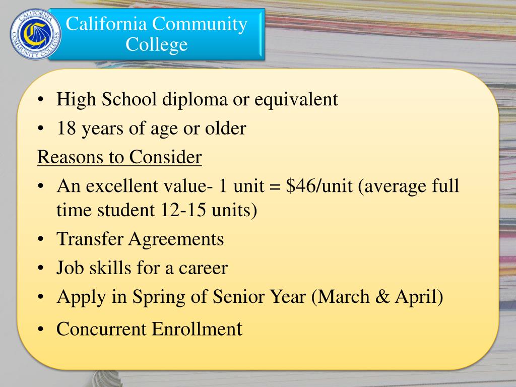 High School diploma or equivalent • 18 years of age or older Reasons to Consider • An excellent value- 1 unit = $46/unit (average full time student 12-15 units) • Transfer Agreements • Job skills for a career • Apply in Spring of Senior Year (March & April) • Concurrent Enrollment
