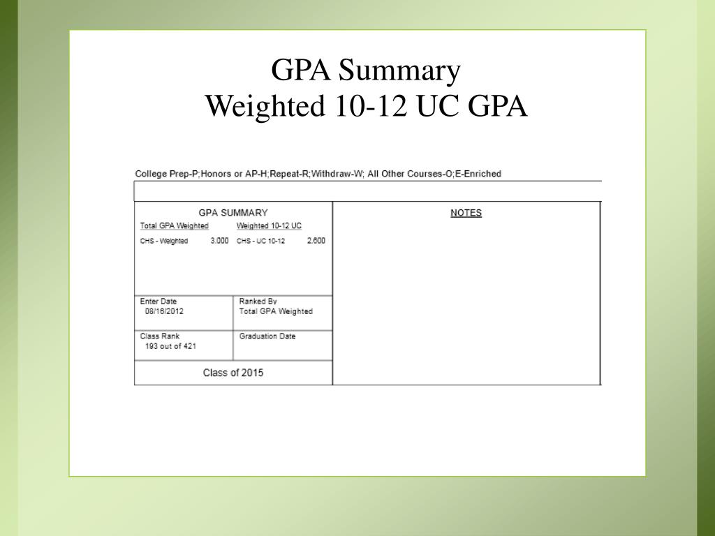 A-G Subject Requirements & GPA • History/Social Science- 2 years • English- 4 years • Math- 3 years* (Algebra, Geometry, Algebra II) • Lab Science- 2 years*(1 yr. Biological, 1 yr. Physical) • LOTE- 2 years* (same language) • Visual & Performing Arts- 1 year • College Prep Elective- 1 year * additional years of subject recommended Must earn a grade of “C” or better both semesters WHS course list: https://doorways.ucop.edu/list