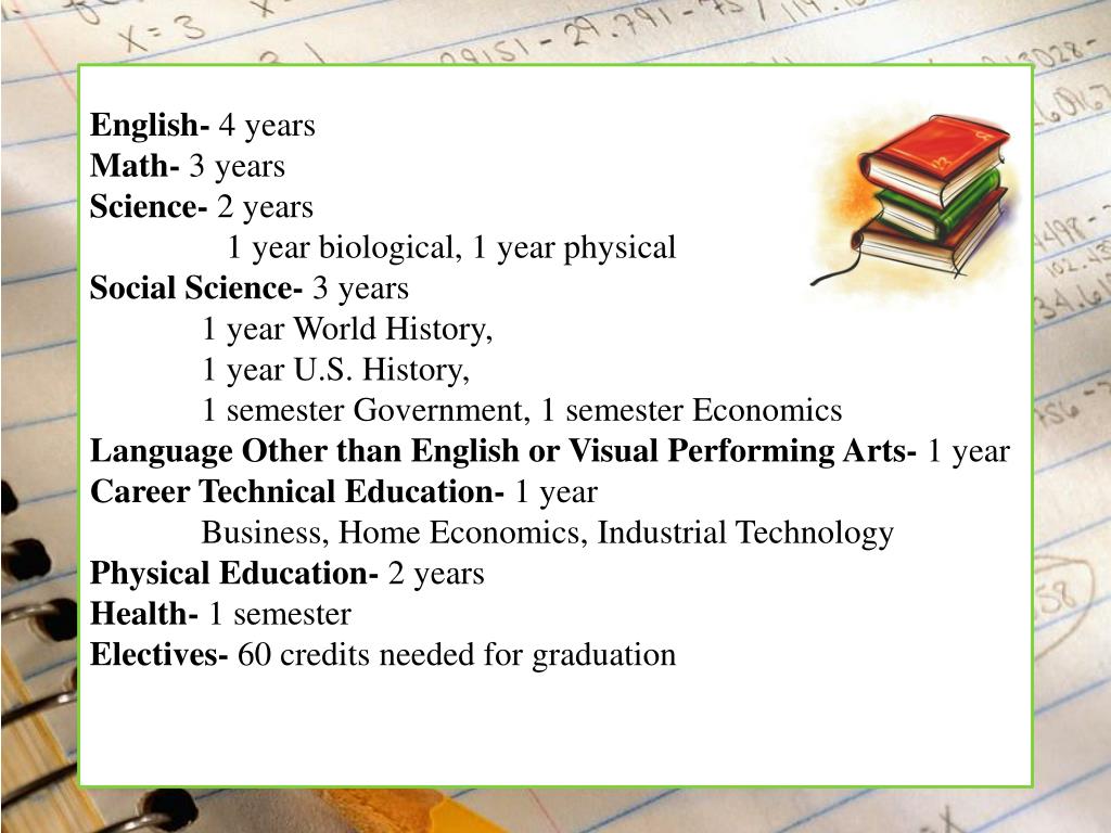 English- 4 years Math- 3 years Science- 2 years 1 year biological, 1 year physical Social Science- 3 years 1 year World History, 1 year U.S. History, 1 semester Government, 1 semester Economics Language Other than English or Visual Performing Arts- 1 year Career Technical Education- 1 year Business, Home Economics, Industrial Technology Physical Education- 2 years Health- 1 semester Electives- 60 credits needed for graduation