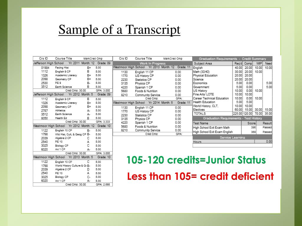 Sample of a Transcript 105-120 credits=Junior Status Less than 105= credit deficient
