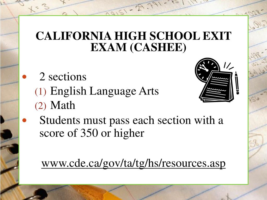 CALIFORNIA HIGH SCHOOL EXIT EXAM (CASHEE) • 2 sections • English Language Arts • Math • Students must pass each section with a score of 350 or higher www.cde.ca/gov/ta/tg/hs/resources.asp