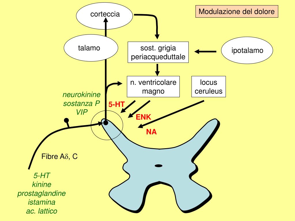 Modulazione del dolore. corteccia. talamo. sost. grigia periacqueduttale. ipotalamo. n. ventricolare magno. locus ceruleus. neurokinine sostanza P VIP. 5-HT. ENK. NA. Fibre A , C. 5-HT kinine prostaglandine istamina ac. lattico. oppiacei morfina, codeina