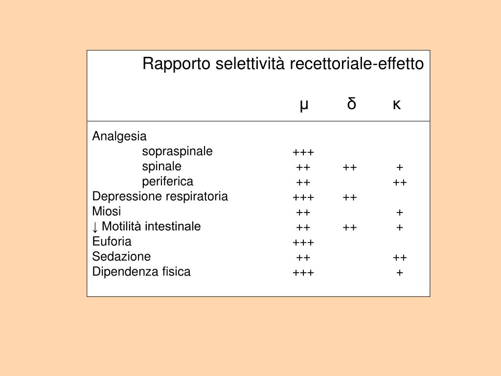 Rapporto selettività recettoriale-effetto μδκ Analgesia sopraspinale +++ spinale ++ ++ + periferica ++ ++ Depressione respiratoria +++ ++ Miosi ++ + ↓ Motilità intestinale ++ ++ + Euforia +++ Sedazione ++ ++ Dipendenza fisica +++ +