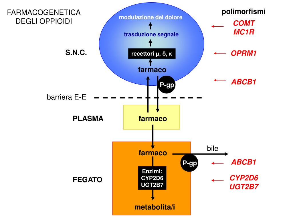 polimorfismi FARMACOGENETICA DEGLI OPPIOIDI modulazione del dolore COMT MC1R trasduzione segnale S.N.C. recettori μ, δ, κ OPRM1 farmaco ABCB1 barriera E-E PLASMA farmaco bile farmaco P-gp P-gp ABCB1 Enzimi: CYP2D6 UGT2B7 FEGATO CYP2D6 UGT2B7 metabolita/i