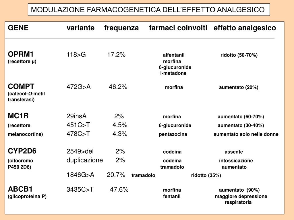 GENE variante frequenza farmaci coinvolti effetto analgesico OPRM1 118>G 17.2%alfentanil ridotto (50-70%) (recettore μ) morfina 6-glucuronide l-metadone COMPT 472G>A 46.2%morfina aumentato (20%) (catecol-O-metil transferasi) MC1R 29insA 2%morfina aumentato (60-70%) (recettore451C>T 4.5%6-glucuronide aumentato (30-40%) melanocortina)478C>T 4.3%pentazocina aumentato solo nelle donne CYP2D6 2549>del 2%codeina assente (citocromo duplicazione 2%codeina intossicazione P450 2D6) tramadolo aumentato 1846G>A 20.7%tramadolo ridotto (35%) ABCB1 3435C>T 47.6%morfina aumentato (90%) (glicoproteina P) fentanil maggiore depressione respiratoria MODULAZIONE FARMACOGENETICA DELL’EFFETTO ANALGESICO