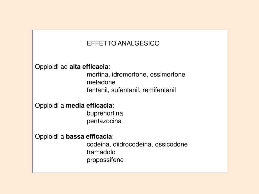 EFFETTO ANALGESICO Oppioidi ad alta efficacia: morfina, idromorfone, ossimorfone metadone fentanil, sufentanil, remifentanil Oppioidi a media efficacia: buprenorfina pentazocina Oppioidi a bassa efficacia: codeina, diidrocodeina, ossicodone tramadolo propossifene