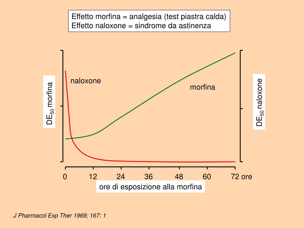 naloxone morfina DE50 morfina DE50 naloxone 0 12 24 36 48 60 72 ore ore di esposizione alla morfina Effetto morfina = analgesia (test piastra calda) Effetto naloxone = sindrome da astinenza J Pharmacol Exp Ther 1969; 167: 1