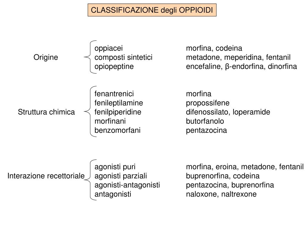 oppiacei morfina, codeina Origine composti sintetici metadone, meperidina, fentanil opiopeptine encefaline, β-endorfina, dinorfina fenantrenici morfina fenileptilamine propossifene Struttura chimica fenilpiperidine difenossilato, loperamide morfinani butorfanolo benzomorfani pentazocina agonisti puri morfina, eroina, metadone, fentanil Interazione recettoriale agonisti parziali buprenorfina, codeina agonisti-antagonisti pentazocina, buprenorfina antagonisti naloxone, naltrexone CLASSIFICAZIONE degli OPPIOIDI