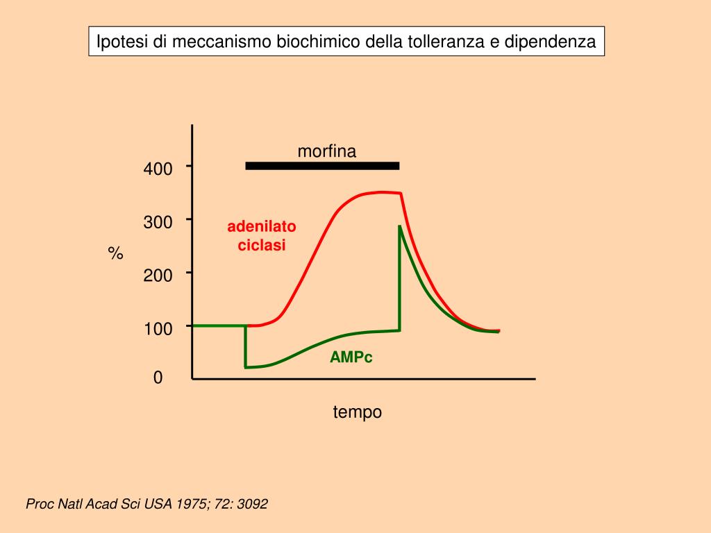 morfina 400 300 % adenilato ciclasi 200 100 AMPc 0 tempo Ipotesi di meccanismo biochimico della tolleranza e dipendenza Proc Natl Acad Sci USA 1975; 72: 3092