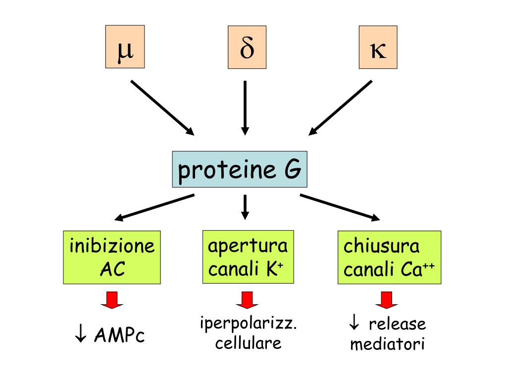 proteine G apertura canali K+ inibizione AC chiusura canali Ca++ iperpolarizz. cellulare release mediatori AMPc