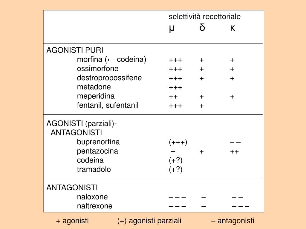 selettività recettoriale μδκ AGONISTI PURI morfina (← codeina) +++ + + ossimorfone +++ + + destropropossifene +++ + + metadone +++ meperidina ++ + + fentanil, sufentanil +++ + AGONISTI (parziali)- - ANTAGONISTI buprenorfina (+++) – – pentazocina – + ++ codeina (+?) tramadolo (+?) ANTAGONISTI naloxone – – – – – – naltrexone – – – – – – – + agonisti (+) agonisti parziali – antagonisti