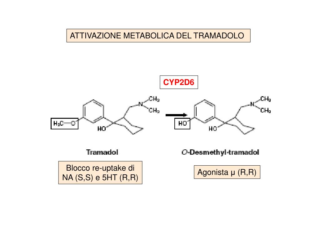 ATTIVAZIONE METABOLICA DEL TRAMADOLO CYP2D6 Blocco re-uptake di NA (S,S) e 5HT (R,R) Agonista μ (R,R)
