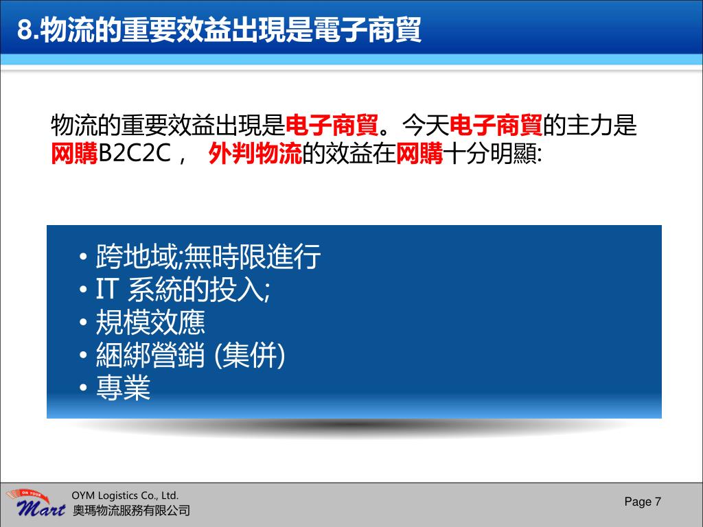 8.物流的重要效益出現是電子商貿 物流的重要效益出現是电子商貿。今天电子商貿的主力是网購B2C2C, 外判物流的效益在网購十分明顯: • 跨地域;無時限進行 • IT 系統的投入; • 規模效應 • 綑綁營銷 (集併) • 專業 Page 7 OYM Logistics Co., Ltd. 奧瑪物流服務有限公司