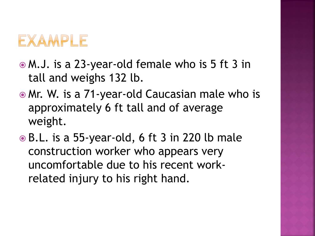 Example • M.J. is a 23-year-old female who is 5 ft 3 in tall and weighs 132 lb. • Mr. W. is a 71-year-old Caucasian male who is approximately 6 ft tall and of average weight. • B.L. is a 55-year-old, 6 ft 3 in 220 lb male construction worker who appears very uncomfortable due to his recent work-related injury to his right hand.