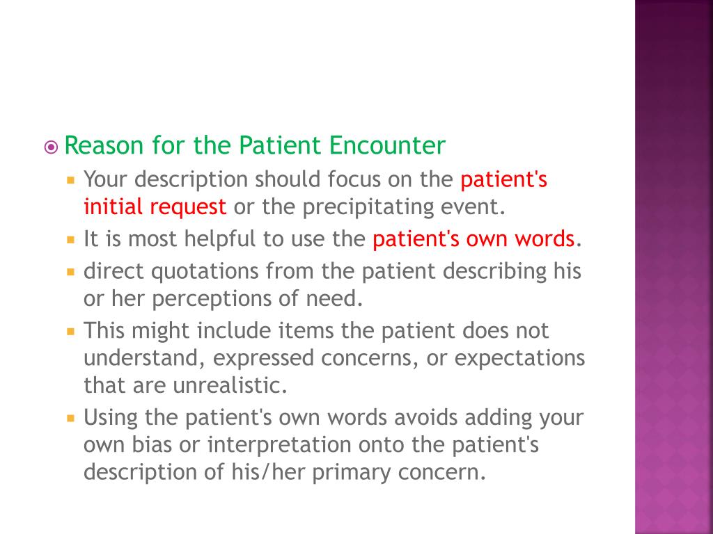 Reason for the Patient Encounter • Your description should focus on the patient's initial request or the precipitating event. • It is most helpful to use the patient's own words. • direct quotations from the patient describing his or her perceptions of need. • This might include items the patient does not understand, expressed concerns, or expectations that are unrealistic. • Using the patient's own words avoids adding your own bias or interpretation onto the patient's description of his/her primary concern.