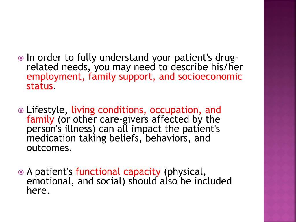 In order to fully understand your patient's drug-related needs, you may need to describe his/her employment, family support, and socioeconomic status. • Lifestyle, living conditions, occupation, and family (or other care-givers affected by the person's illness) can all impact the patient's medication taking beliefs, behaviors, and outcomes. • A patient's functional capacity (physical, emotional, and social) should also be included here.