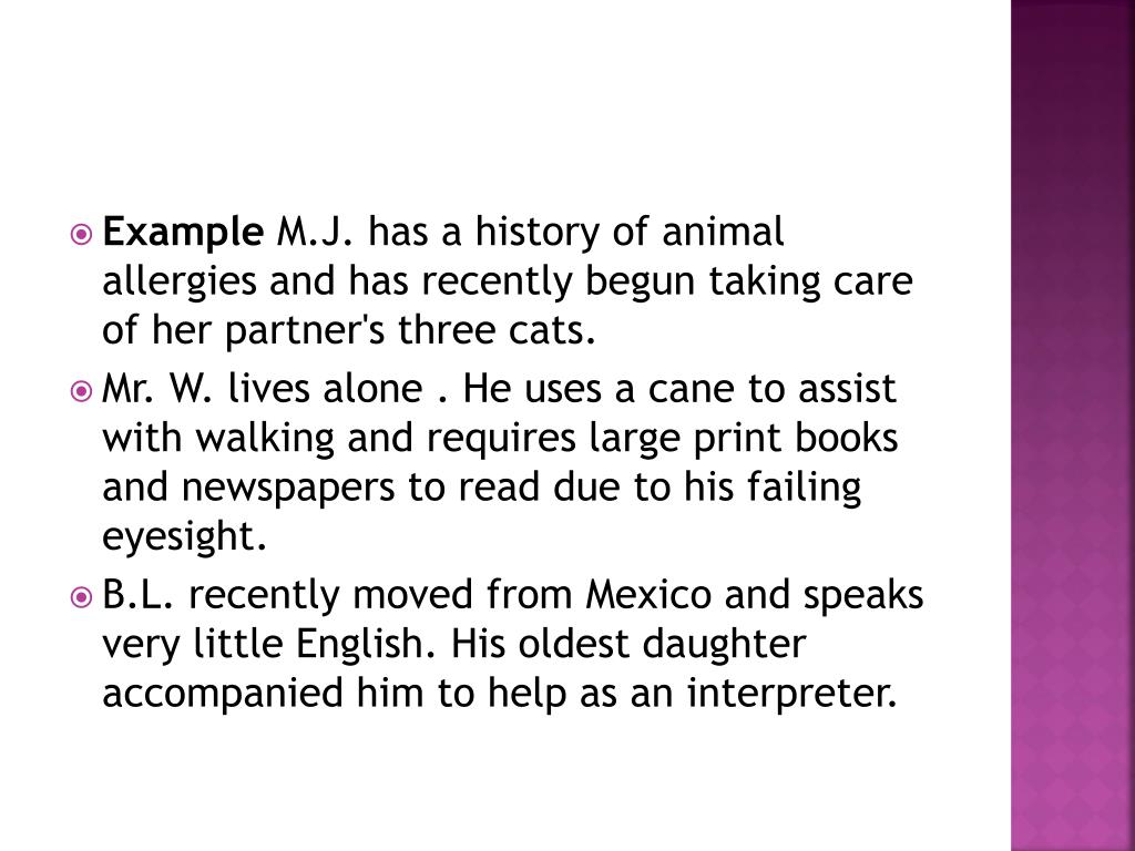 Example M.J. has a history of animal allergies and has recently begun taking care of her partner's three cats. • Mr. W. lives alone . He uses a cane to assist with walking and requires large print books and newspapers to read due to his failing eyesight. • B.L. recently moved from Mexico and speaks very little English. His oldest daughter accompanied him to help as an interpreter.