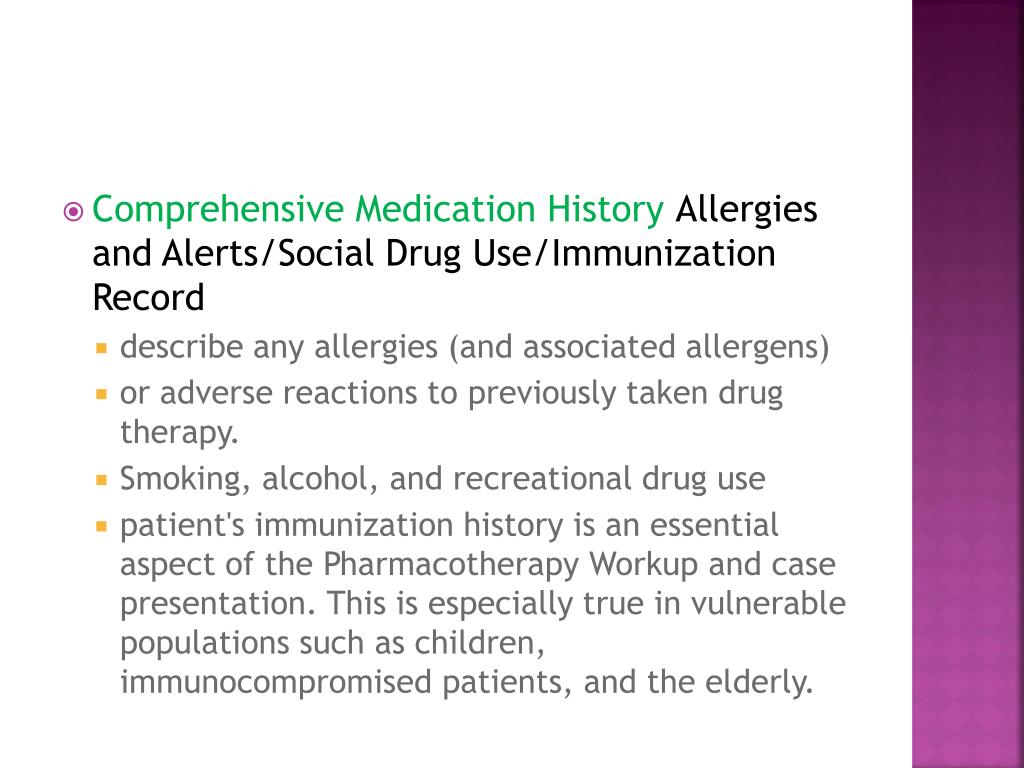 Comprehensive Medication HistoryAllergies and Alerts/Social Drug Use/Immunization Record • describe any allergies (and associated allergens) • or adverse reactions to previously taken drug therapy. • Smoking, alcohol, and recreational drug use • patient's immunization history is an essential aspect of the Pharmacotherapy Workup and case presentation. This is especially true in vulnerable populations such as children, immunocompromised patients, and the elderly.