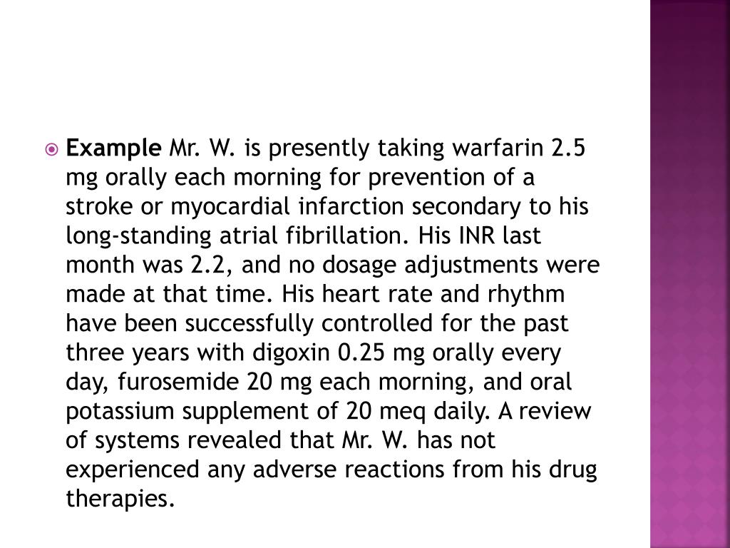 Example Mr. W. is presently taking warfarin 2.5 mg orally each morning for prevention of a stroke or myocardial infarction secondary to his long-standing atrial fibrillation. His INR last month was 2.2, and no dosage adjustments were made at that time. His heart rate and rhythm have been successfully controlled for the past three years with digoxin 0.25 mg orally every day, furosemide 20 mg each morning, and oral potassium supplement of 20 meq daily. A review of systems revealed that Mr. W. has not experienced any adverse reactions from his drug therapies.