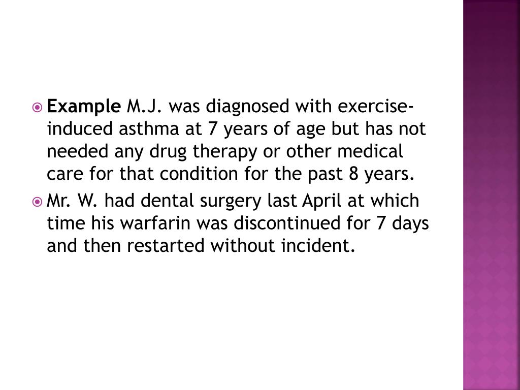 Example M.J. was diagnosed with exercise-induced asthma at 7 years of age but has not needed any drug therapy or other medical care for that condition for the past 8 years. • Mr. W. had dental surgery last April at which time his warfarin was discontinued for 7 days and then restarted without incident.