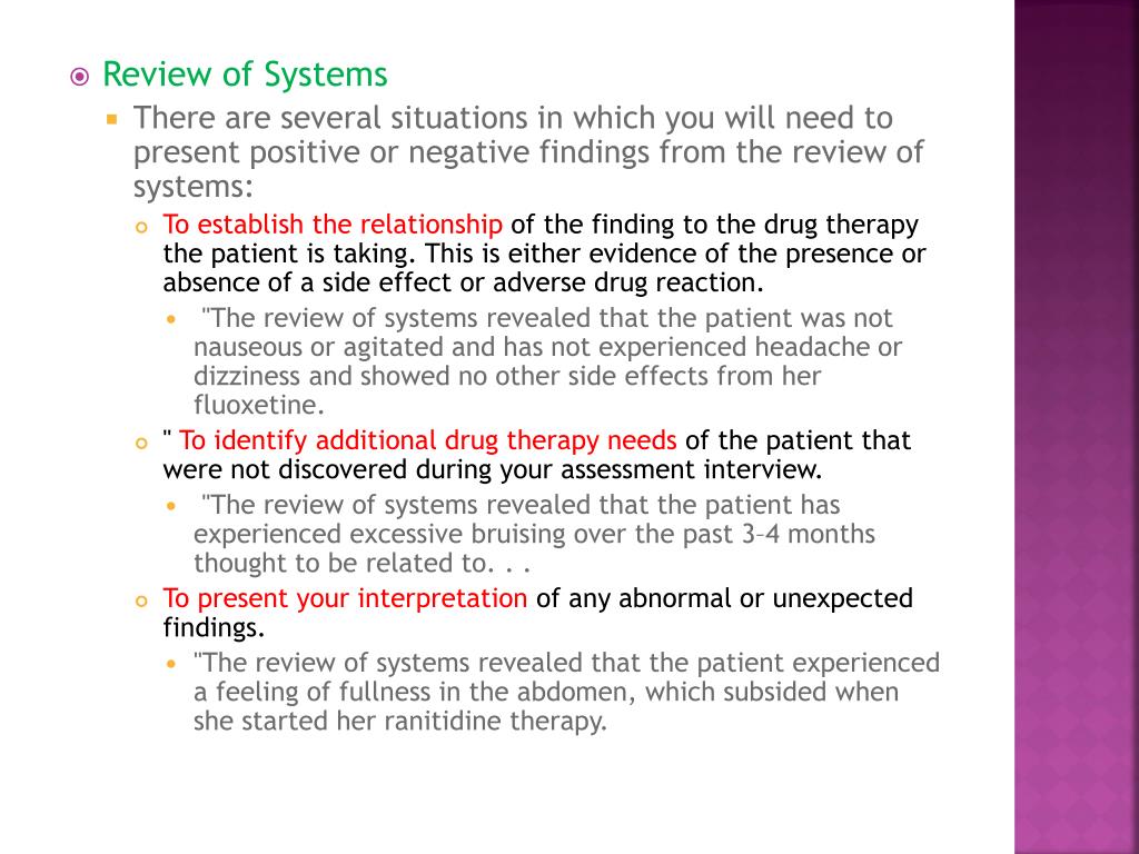 Review of Systems • There are several situations in which you will need to present positive or negative findings from the review of systems: • To establish the relationship of the finding to the drug therapy the patient is taking. This is either evidence of the presence or absence of a side effect or adverse drug reaction. • "The review of systems revealed that the patient was not nauseous or agitated and has not experienced headache or dizziness and showed no other side effects from her fluoxetine. • " To identify additional drug therapy needs of the patient that were not discovered during your assessment interview. • "The review of systems revealed that the patient has experienced excessive bruising over the past 3–4 months thought to be related to. . . • To present your interpretation of any abnormal or unexpected findings. • "The review of systems revealed that the patient experienced a feeling of fullness in the abdomen, which subsided when she started her ranitidine therapy.