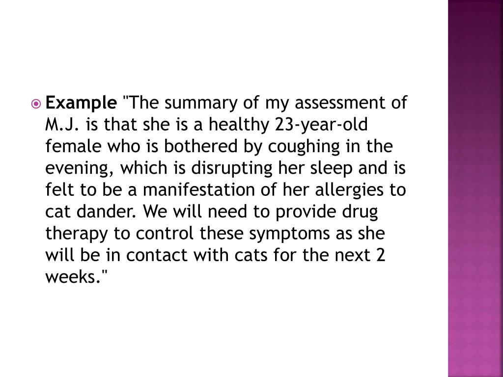 Example "The summary of my assessment of M.J. is that she is a healthy 23-year-old female who is bothered by coughing in the evening, which is disrupting her sleep and is felt to be a manifestation of her allergies to cat dander. We will need to provide drug therapy to control these symptoms as she will be in contact with cats for the next 2 weeks."