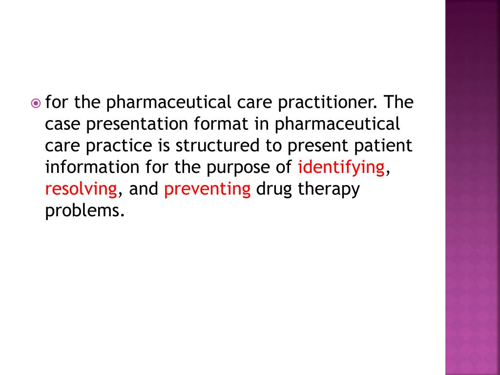 for the pharmaceutical care practitioner. The case presentation format in pharmaceutical care practice is structured to present patient information for the purpose of identifying, resolving, and preventing drug therapy problems.