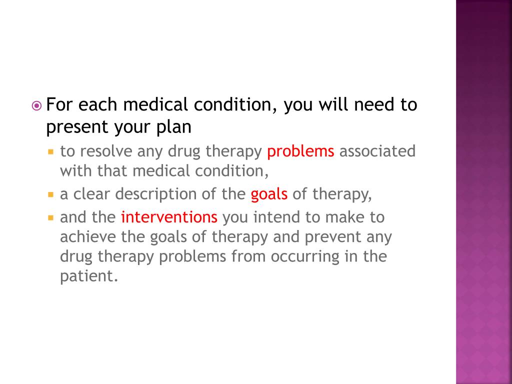 For each medical condition, you will need to present your plan • to resolve any drug therapy problems associated with that medical condition, • a clear description of the goals of therapy, • and the interventions you intend to make to achieve the goals of therapy and prevent any drug therapy problems from occurring in the patient.