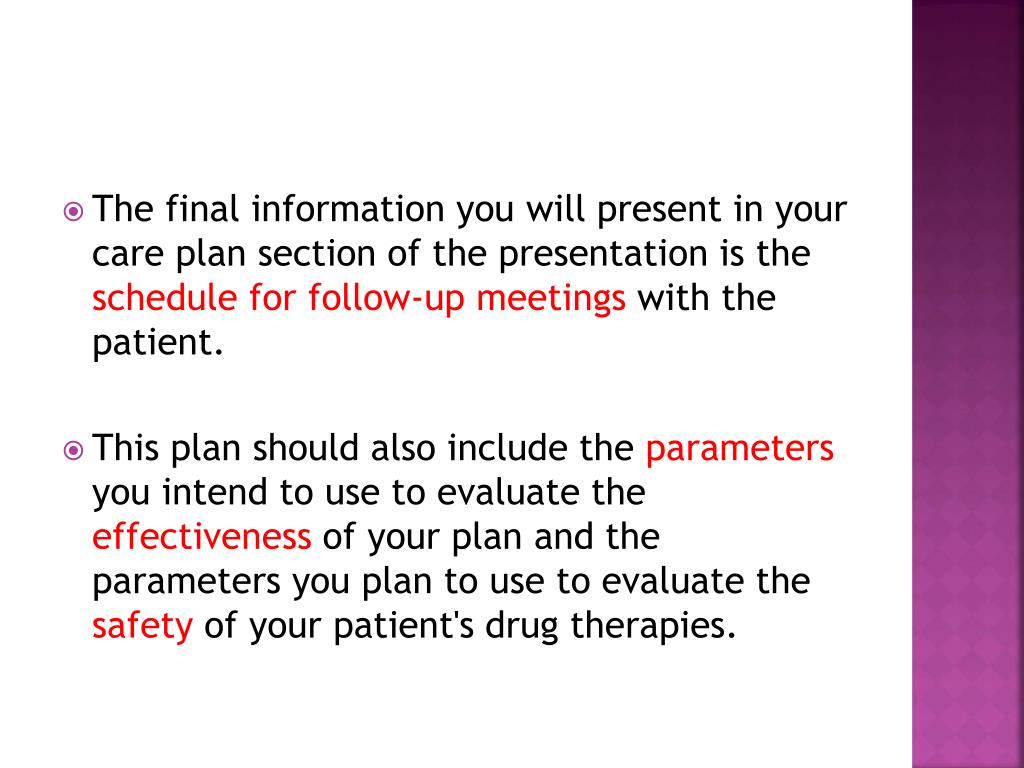 The final information you will present in your care plan section of the presentation is the schedule for follow-up meetings with the patient. • This plan should also include the parameters you intend to use to evaluate the effectiveness of your plan and the parameters you plan to use to evaluate the safety of your patient's drug therapies.