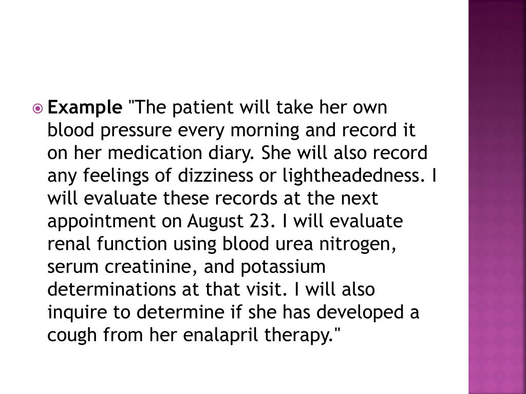Example "The patient will take her own blood pressure every morning and record it on her medication diary. She will also record any feelings of dizziness or lightheadedness. I will evaluate these records at the next appointment on August 23. I will evaluate renal function using blood urea nitrogen, serum creatinine, and potassium determinations at that visit. I will also inquire to determine if she has developed a cough from her enalapril therapy."