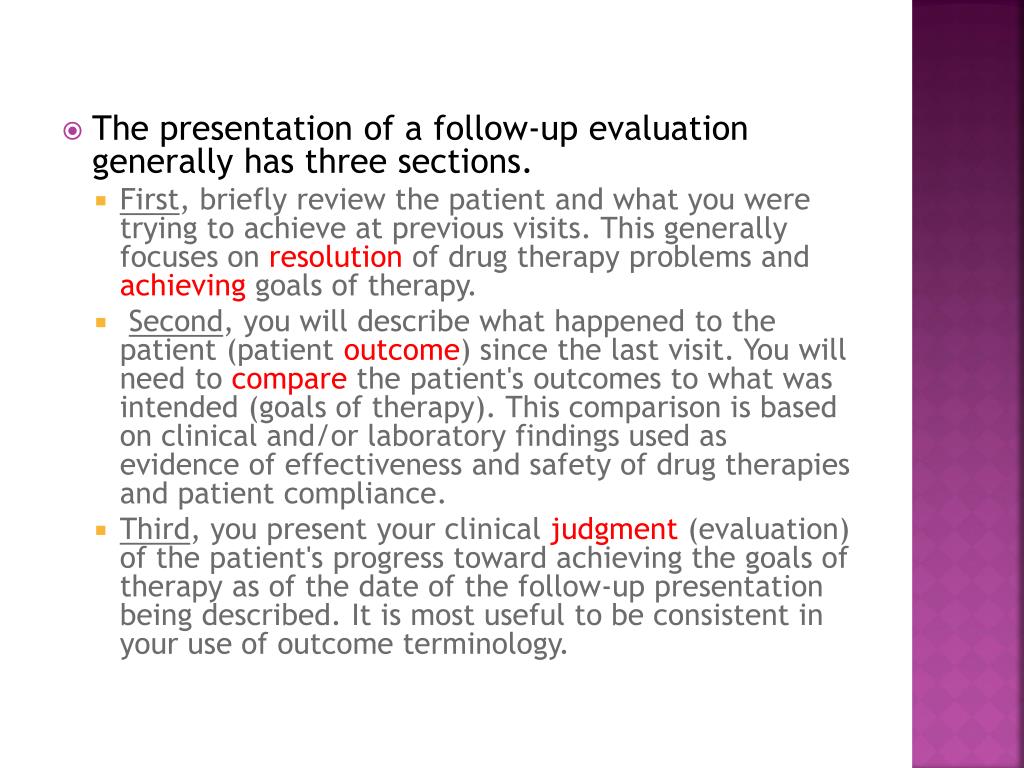 The presentation of a follow-up evaluation generally has three sections. • First, briefly review the patient and what you were trying to achieve at previous visits. This generally focuses on resolution of drug therapy problems and achieving goals of therapy. • Second, you will describe what happened to the patient (patient outcome) since the last visit. You will need to compare the patient's outcomes to what was intended (goals of therapy). This comparison is based on clinical and/or laboratory findings used as evidence of effectiveness and safety of drug therapies and patient compliance. • Third, you present your clinical judgment (evaluation) of the patient's progress toward achieving the goals of therapy as of the date of the follow-up presentation being described. It is most useful to be consistent in your use of outcome terminology.