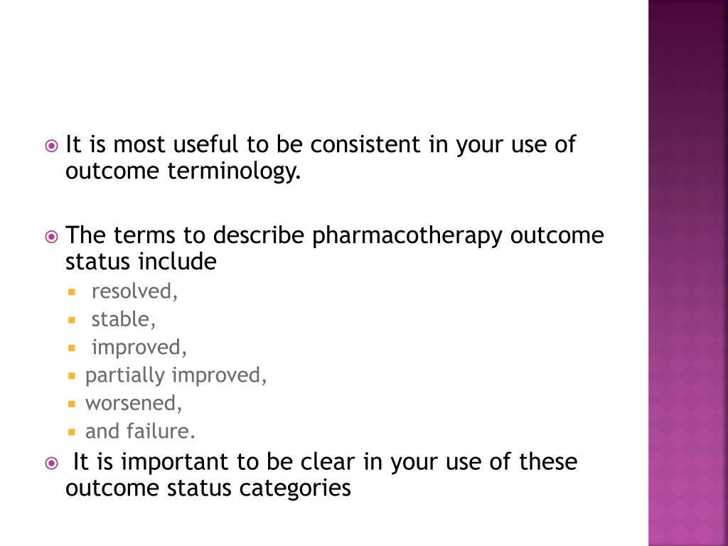 It is most useful to be consistent in your use of outcome terminology. • The terms to describe pharmacotherapy outcome status include • resolved, • stable, • improved, • partially improved, • worsened, • and failure. • It is important to be clear in your use of these outcome status categories