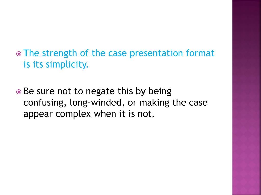 The strength of the case presentation format is its simplicity. • Be sure not to negate this by being confusing, long-winded, or making the case appear complex when it is not.