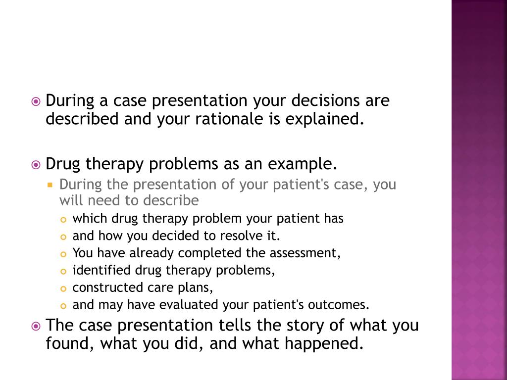 During a case presentation your decisions are described and your rationale is explained. • Drug therapy problems as anexample. • During the presentation of your patient's case, you will need to describe • which drug therapy problem your patient has • and how you decided to resolve it. • You have already completed the assessment, • identified drug therapy problems, • constructed care plans, • and may have evaluated your patient's outcomes. • The case presentation tells the story of what you found, what you did, and what happened.