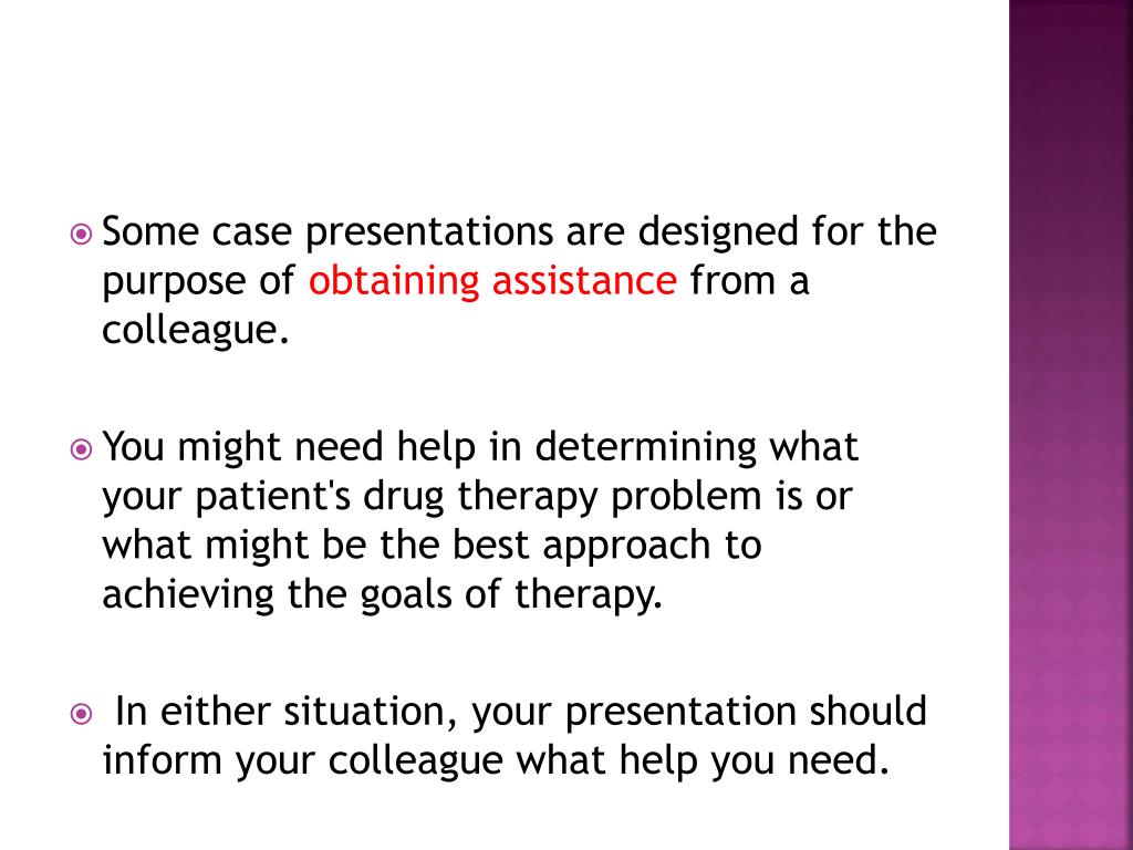 Some case presentations are designed for the purpose of obtaining assistance from a colleague. • You might need help in determining what your patient's drug therapy problem is or what might be the best approach to achieving the goals of therapy. • In either situation, your presentation should inform your colleague what help you need.