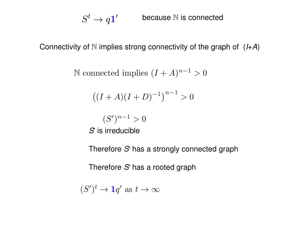 because N is connected Connectivity of N implies strong connectivity of the graph of (I+A) S' is irreducible Therefore S0has a strongly connected graph Therefore S0 has a rooted graph