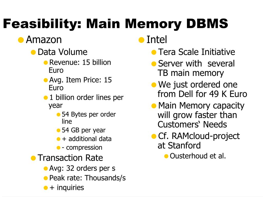 Feasibility: Main Memory DBMS • Amazon • Data Volume • Revenue: 15 billion Euro • Avg. Item Price: 15 Euro • 1 billion order lines per year • 54 Bytes per order line • 54 GB per year • + additional data • - compression • Transaction Rate • Avg: 32 orders per s • Peak rate: Thousands/s • + inquiries • Intel • TeraScale Initiative • Server withseveral TB mainmemory • We just orderedonefrom Dell for 49 K Euro • Main Memory capacity will growfasterthan Customers‘ Needs • Cf. RAMcloud-projectat Stanford • Ousterhoud et al.