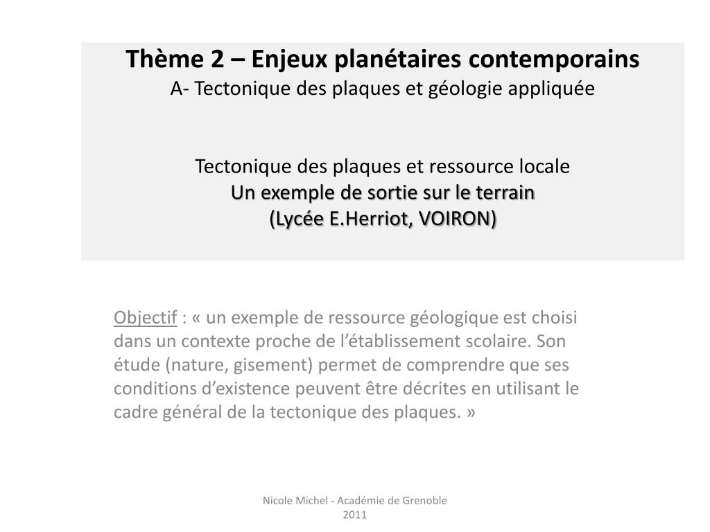 Thème 2 – Enjeux planétaires contemporainsA- Tectonique des plaques et géologie appliquéeTectonique des plaques et ressource localeUn exemple de sortie sur le terrain(Lycée E.Herriot, VOIRON) Objectif : « un exemple de ressource géologique est choisi dans un contexte proche de l’établissement scolaire. Son étude (nature, gisement) permet de comprendre que ses conditions d’existence peuvent être décrites en utilisant le cadre général de la tectonique des plaques. » Nicole Michel - Académie de Grenoble 2011