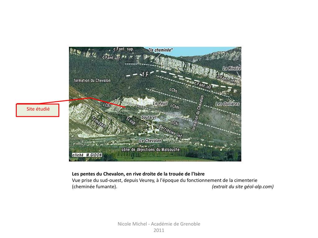Site étudié Les pentes du Chevalon, en rive droite de la trouée de l'IsèreVue prise du sud-ouest, depuis Veurey, à l'époque du fonctionnement de la cimenterie (cheminée fumante). (extrait du site géol-alp.com) Nicole Michel - Académie de Grenoble 2011