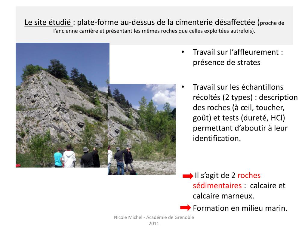 Le site étudié : plate-forme au-dessus de la cimenterie désaffectée (proche de l’ancienne carrière et présentant les mêmes roches que celles exploitées autrefois). • Travail sur l’affleurement : présence de strates • Travail sur les échantillons récoltés (2 types) : description des roches (à œil, toucher, goût) et tests (dureté, HCl) permettant d’aboutir à leur identification. Il s’agit de 2 roches sédimentaires : calcaire et calcaire marneux. Formation en milieu marin. Nicole Michel - Académie de Grenoble 2011