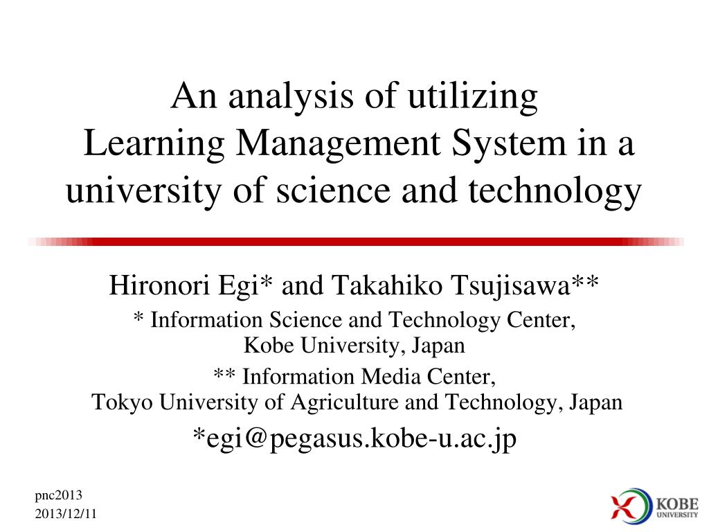 An analysis of utilizingLearning Management System in a university of science and technology Hironori Egi* and Takahiko Tsujisawa** * Information Science and Technology Center,Kobe University, Japan ** Information Media Center,Tokyo University of Agriculture and Technology, Japan *egi@pegasus.kobe-u.ac.jp pnc2013